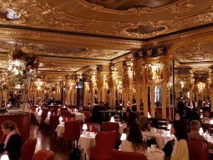 Setting-opulent, gold gilded mirrors, painted ceilings, live jazz pianist on the grand piano