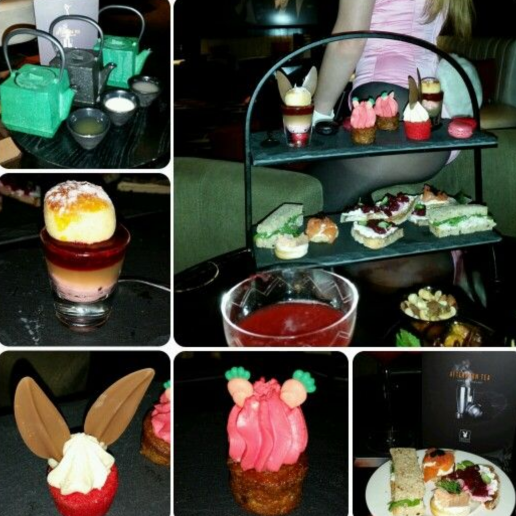 Tea twist-savoury selection not standard but bruschetta, mini baguettes and seafood bread rolls. Bunny ear cup cakes so cute and tasty. The standard scones and jam are served in a shot glass!