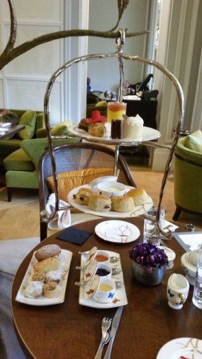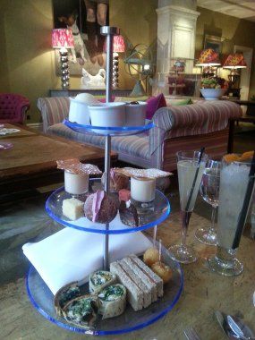 Tea twist-quirky tea-stand is hung on a metal tree overhanging the table. Very unique and apt. Sandwiches are uniquely rolled up with exquisite fillings. Scones served warm and freshly baked seasonal cakes also served.